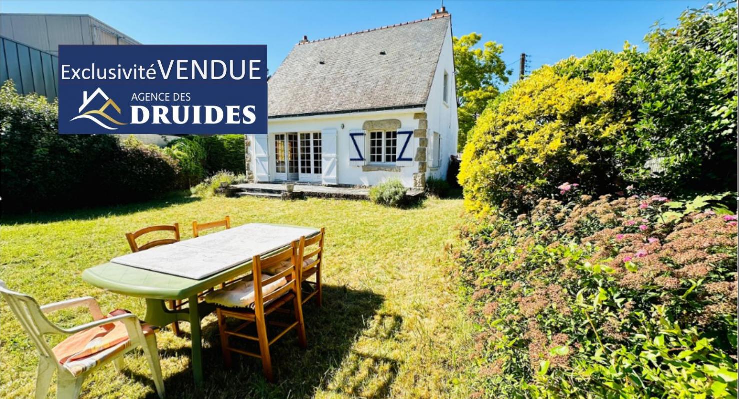 CARNAC 400M grande plage et Beaumer, Au calme d’une impasse charmante maison des années 70 offrant : entrée, séjour salon lumineux de 21m² avec cheminée 4 chambres dont 2 en rez de jardin, 2 salle d’eau et wc, cuisine séparée. Elle dispose également d’une belle terrasse Sud sur jardin clos et arboré de 450m² avec garage en dépendance. Possibilité d’extension CES 35% . Travaux à prévoir .