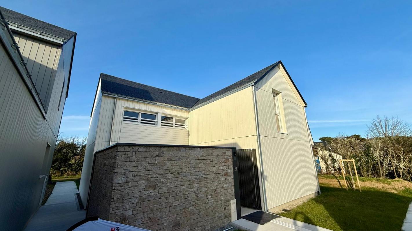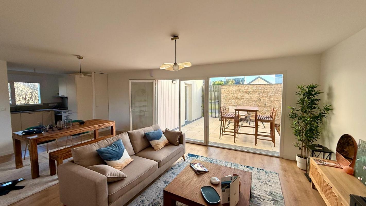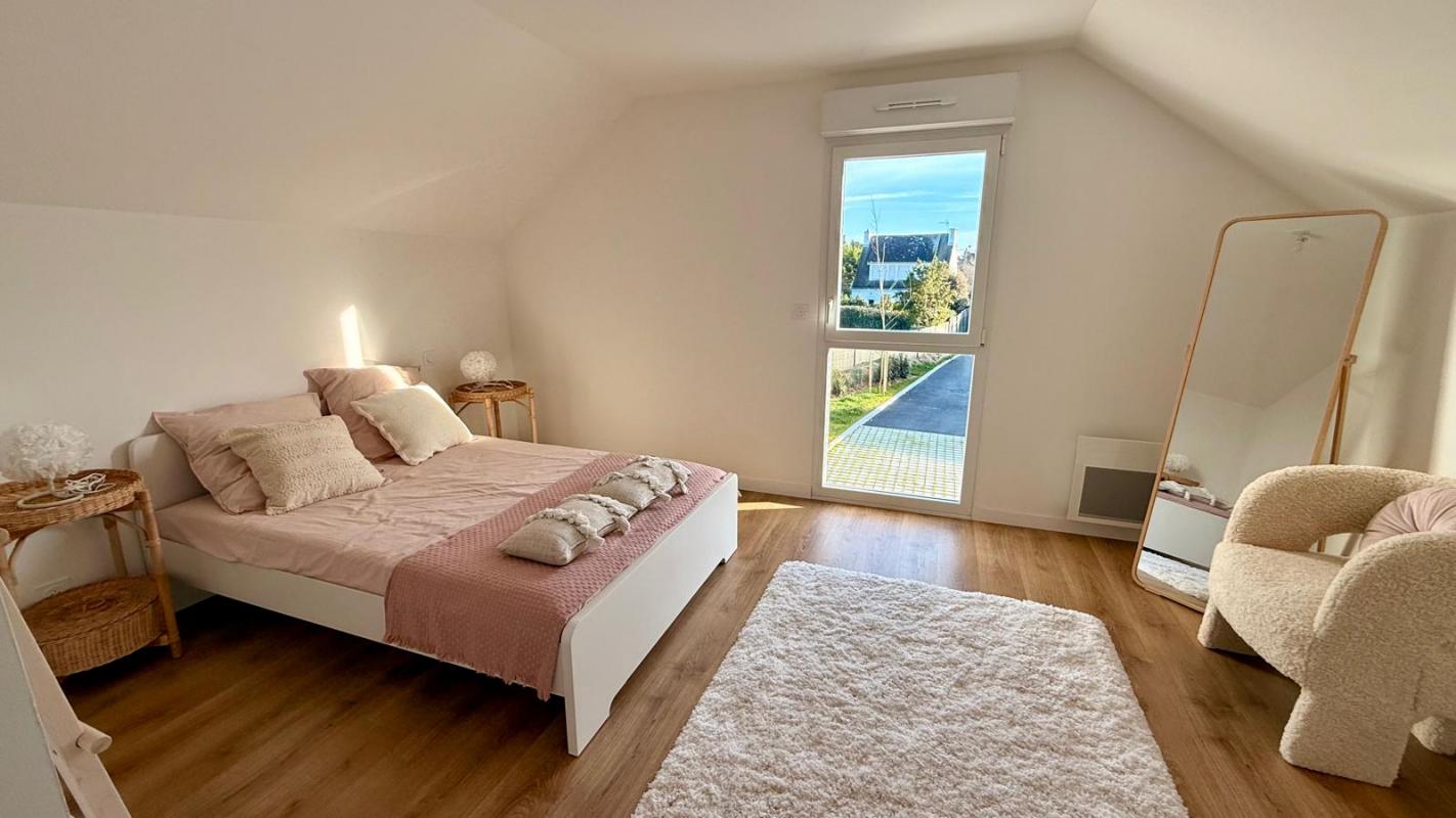 CARNAC, entre bourg et plage, Maison neuve 4 chambres de 118m². Elle offre une superbe pièce de vie de 32m² avec cheminée, cuisine ouverte aménagée et équipée, une chambre en rez de jardin avec sa salle d’eau privative, wc séparés. A l’étage 3 belles chambres dont une avec salle d’eau privative, salle de bains et wc séparés.