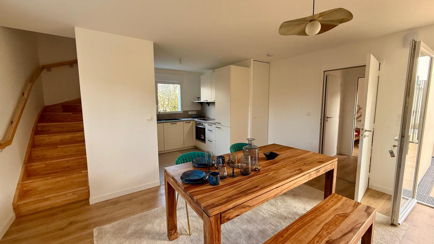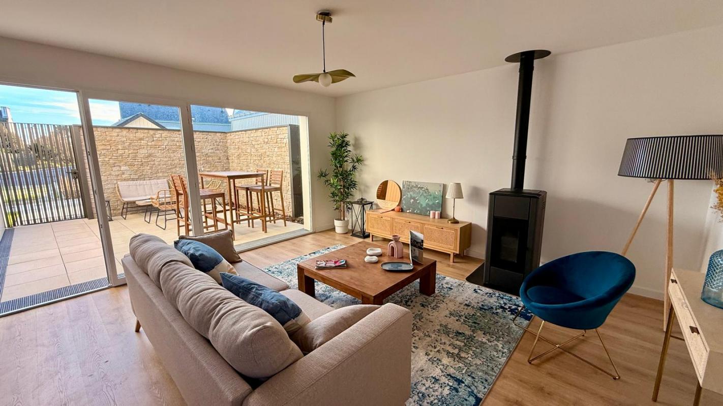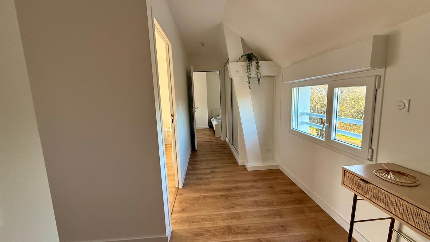CARNAC, entre bourg et plage, Maison neuve 4 chambres de 118m². Elle offre une superbe pièce de vie de 32m² avec cheminée, cuisine ouverte aménagée et équipée, une chambre en rez de jardin avec sa salle d’eau privative, wc séparés. A l’étage 3 belles chambres dont une avec salle d’eau privative, salle de bains et wc séparés.